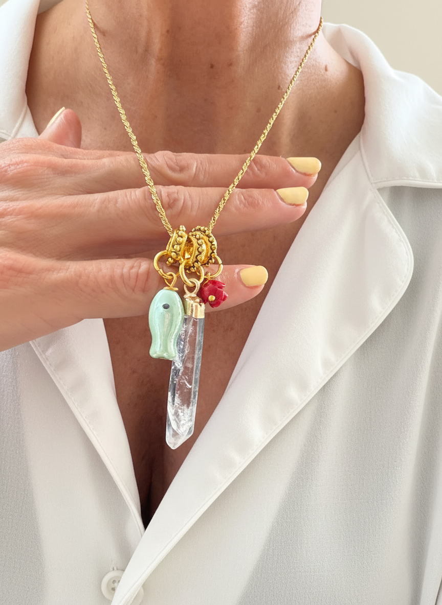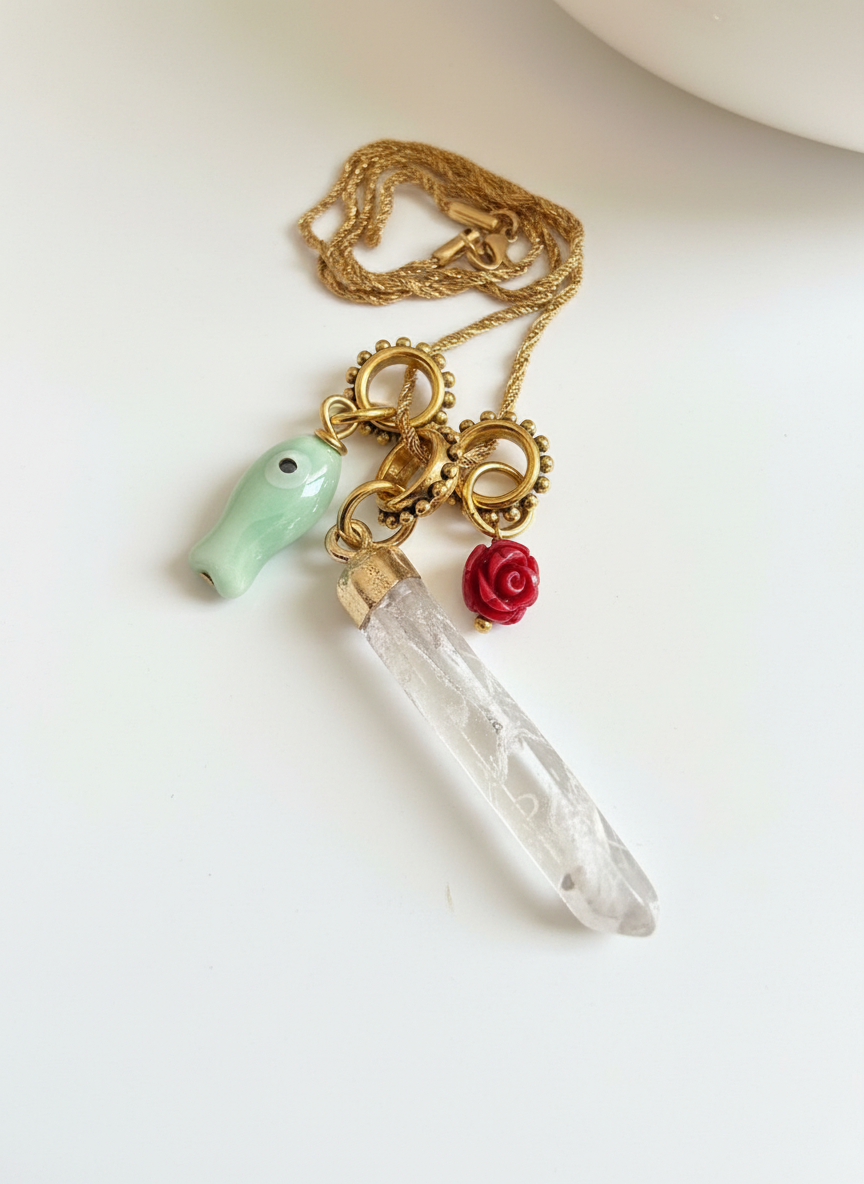 cuelga tres amuletos : pez ( abundancia ) cuarzo cristal bruto ( energía) flor 🥰