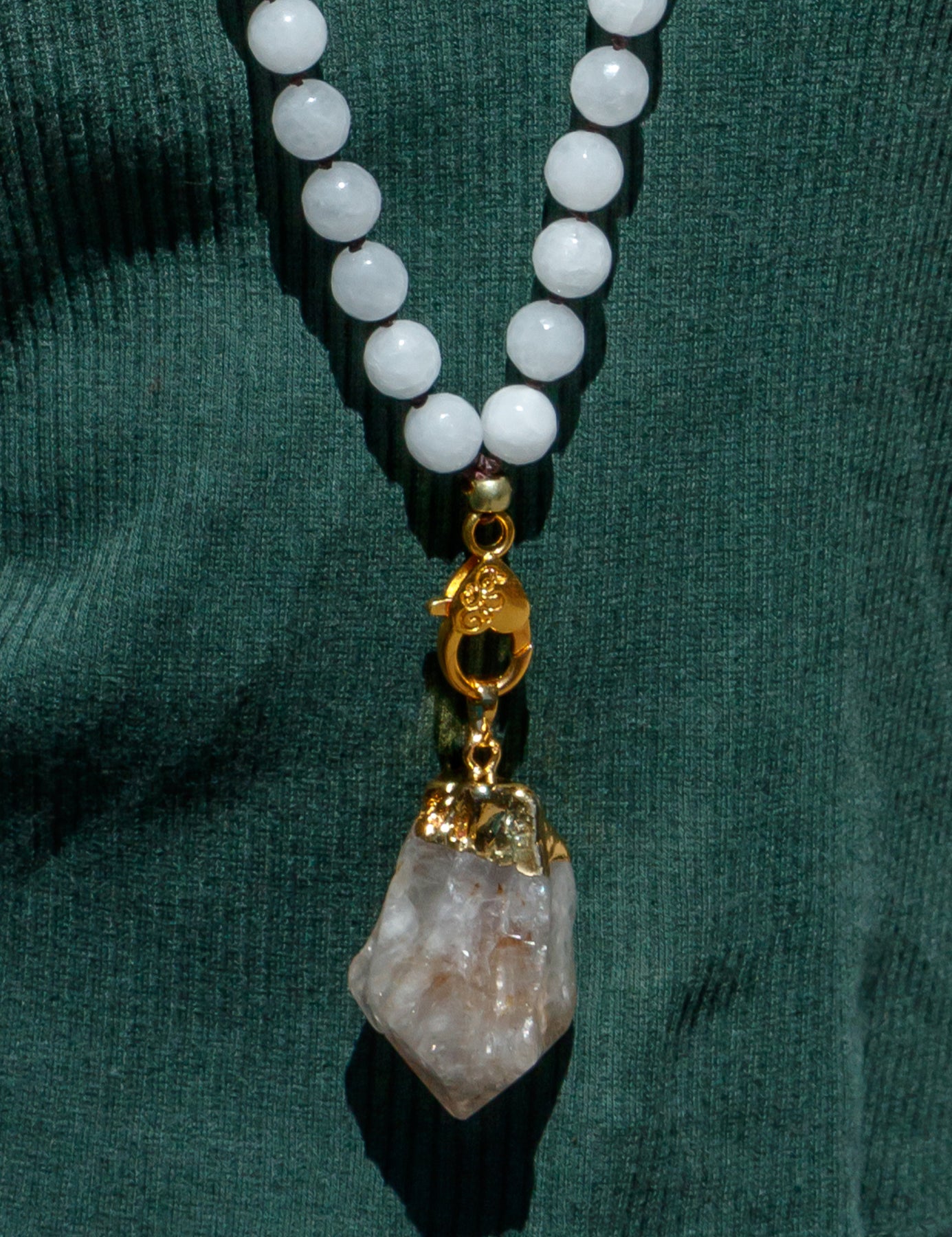 Collar de ágata blanca del 8, collar con gancho del cual cuelga un colgante bruto de citrino.