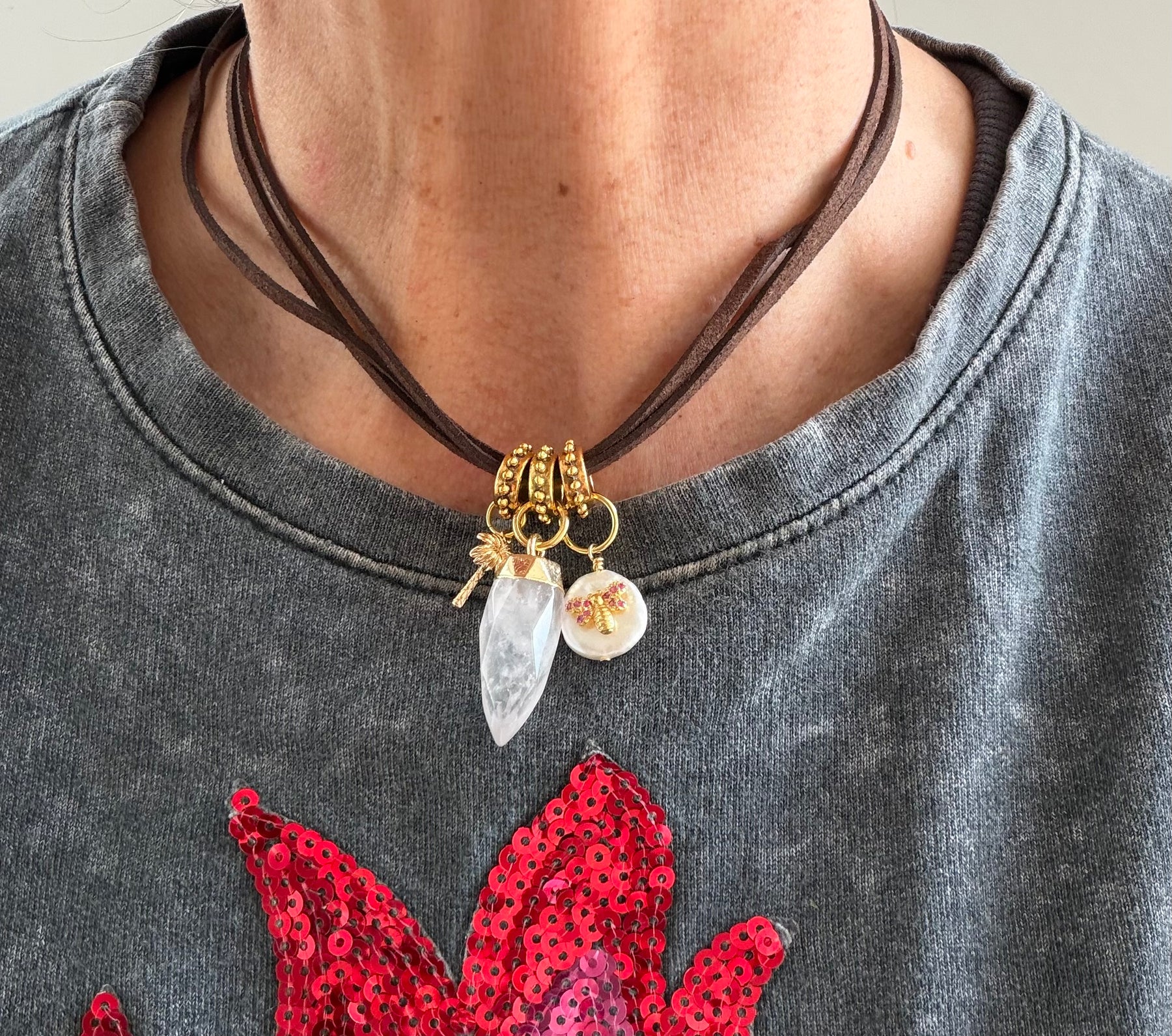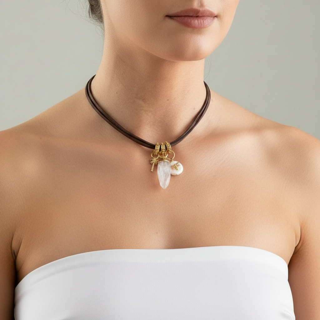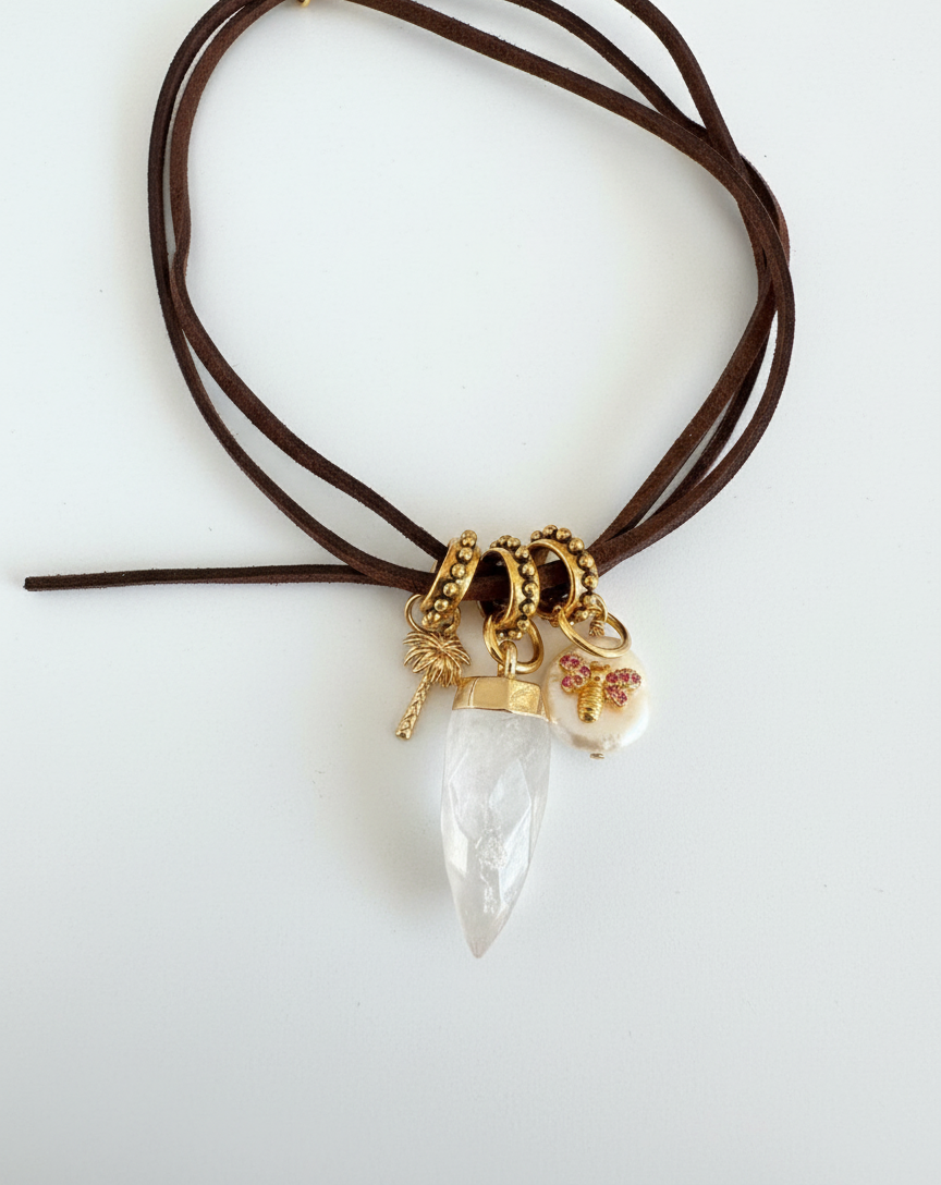 Cuero tamizado café moro con tres colgantes , una palmera 🌴 pequeña , un cuarzo blanco hexagonal y una perla de río con una libélula incrustada