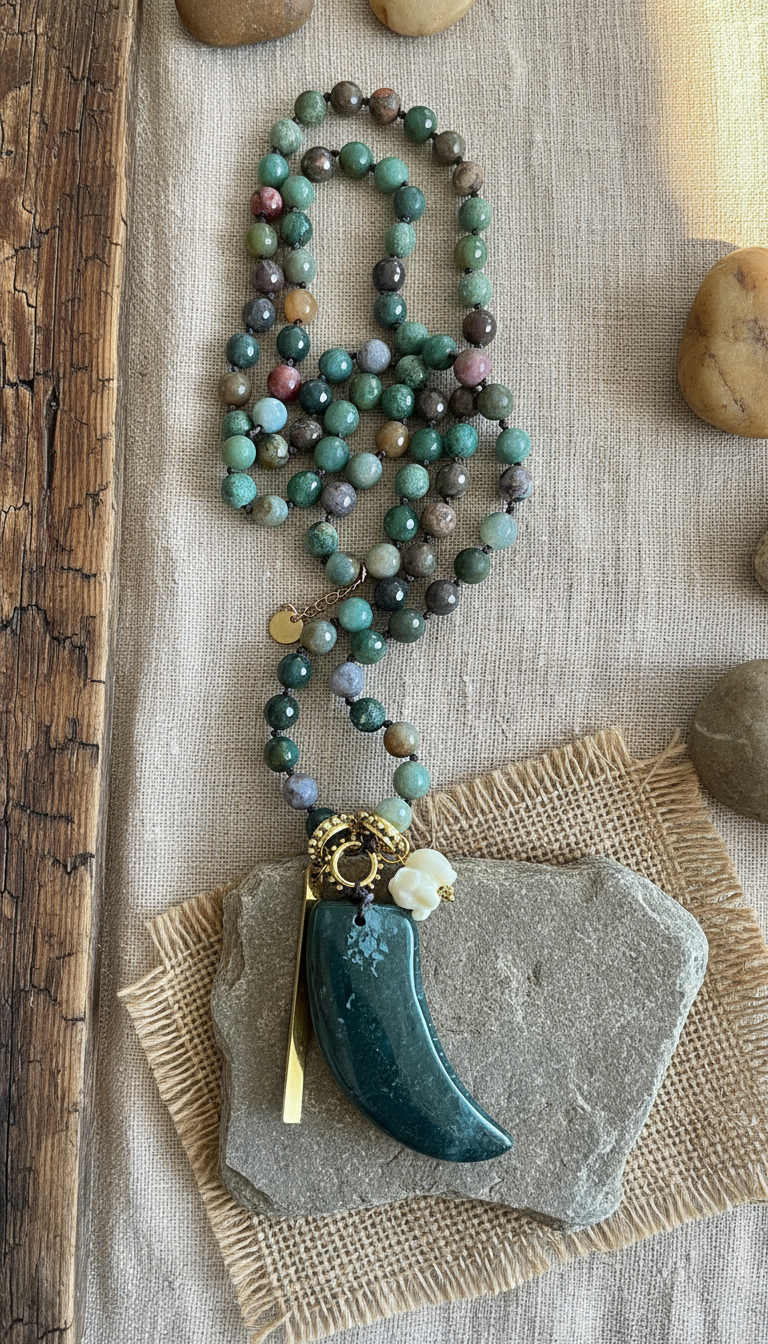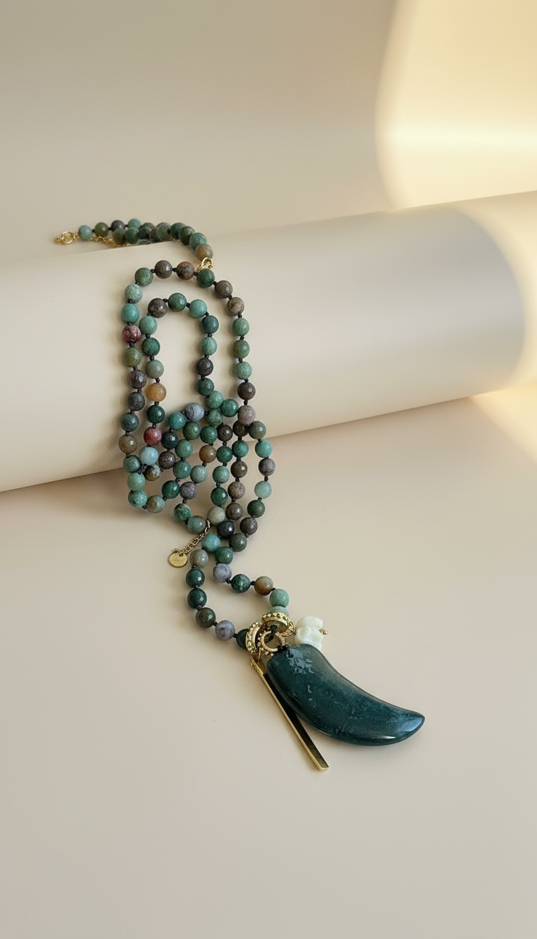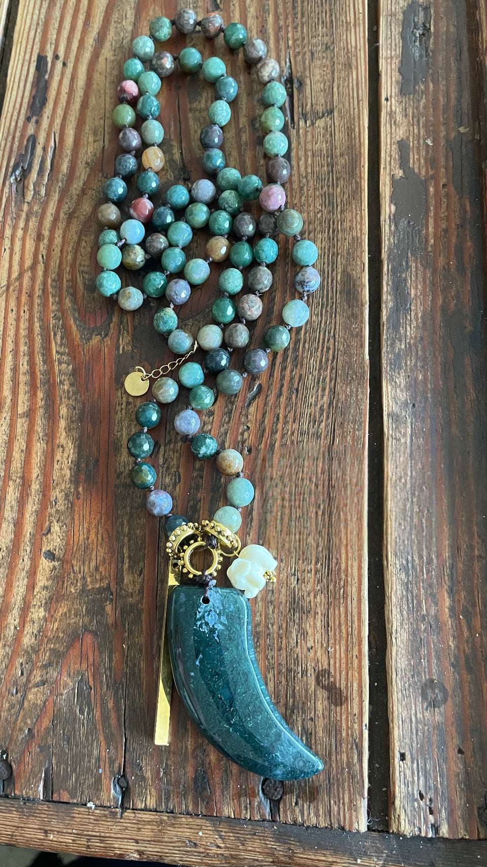 colgante; cacho de ágata y amuletos de la suerte y buena fortuna.